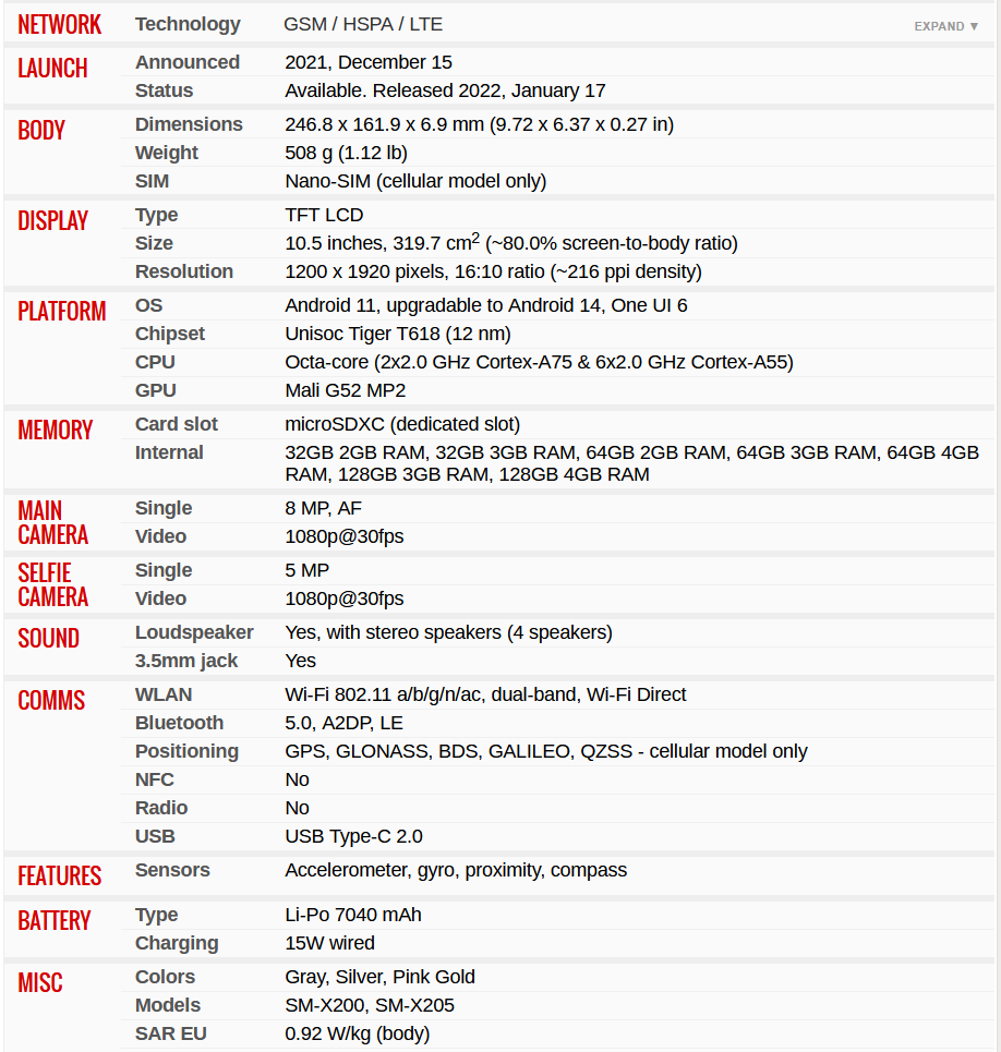 Galaxy Tab A8 Specifications